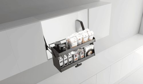 Untuk kabinet atas, Soft-Close Lifting Unit menjadi solusi elegan dan ergonomis. Mekanismenya sangat mudah digunakan—rak dapat ditarik ke bawah dengan lembut, sehingga memudahkan akses tanpa perlu menjangkau terlalu tinggi. Sistem ini juga membantu memanfaatkan ruang vertikal secara optimal